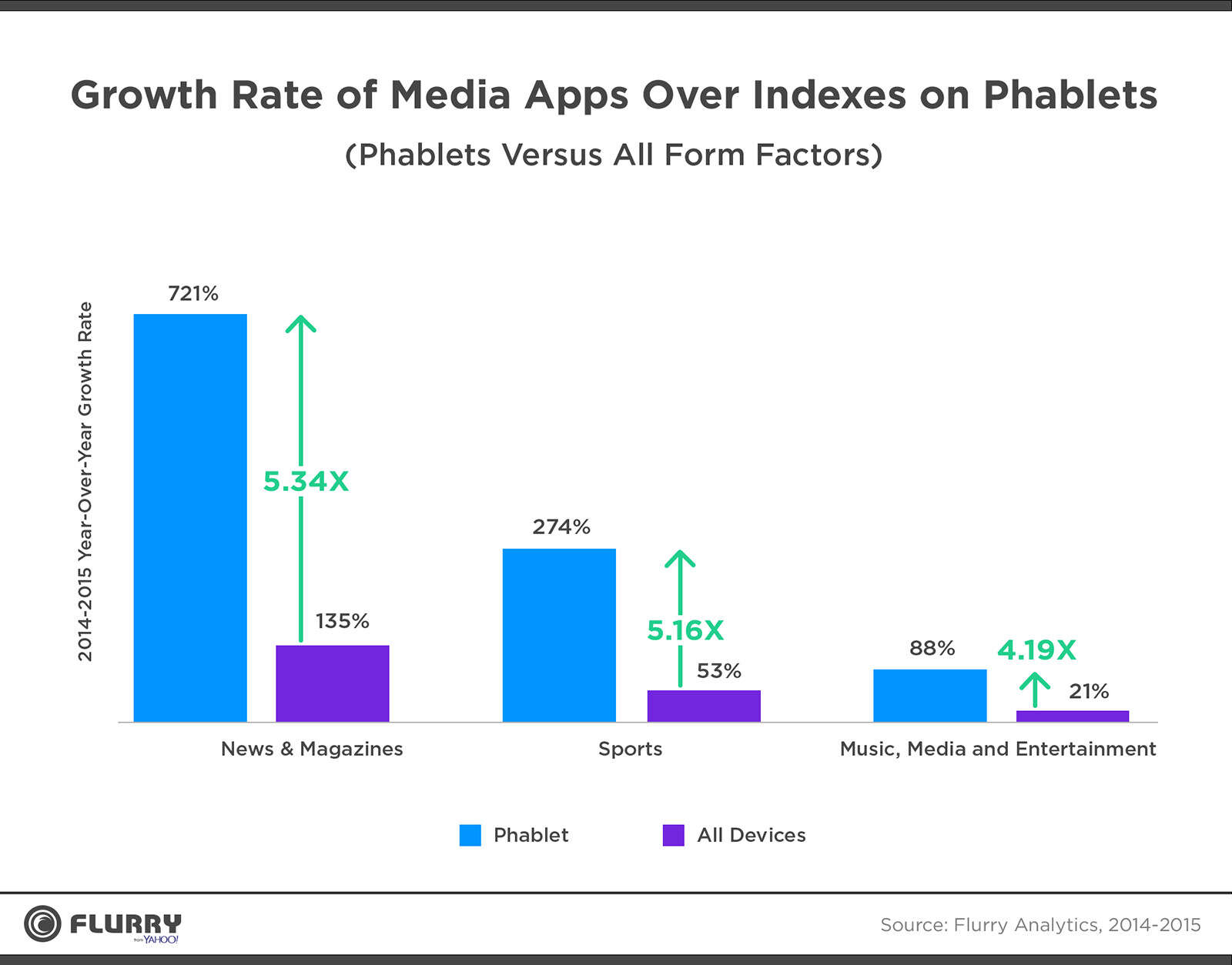 根据 Yahoo Flurry 观察,去年整体移动使用量(注1)增长58%。其中个性化 App 爆炸性增长达332%、新闻和杂志 App、以及生产力工具 App 纷成耀眼新星,增长率破百;而手游 App 使用量连续两年下滑,去年负增长1%。 2015年大屏幕手机(Phablet)称霸!使用者在大屏幕手机花费时间相较去年飙升超过3倍,更成圣诞送礼的热门首选!