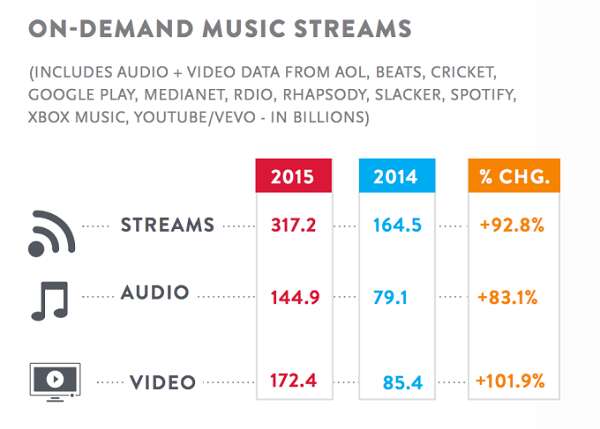 对于流媒体服务来说,2015是非常棒的一年。根据尼尔森的年度音乐报告,去年流媒体服务的点播数增长到了3170亿,比2014年的1645亿翻了一番。有趣的是,流媒体的强势,也对专辑销量产生了明显的影响——同年,专辑销量下滑了6个百分点;不过与2014年的“-11%”相比,这个数字还不算太难看。