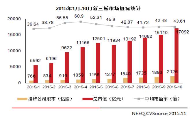 目前新三板的融资规模不断增大,根据全国中小企业股份转让系统披露以及投中集团旗下数据产品CVSource统计,截至2015年11月30日,总股本2,463.07亿股,环比上涨15.84%,总市值20,807.51亿元,环比上涨21.74%,整体市场平均市盈率达到47.97倍,环比上涨10.00%。
