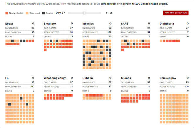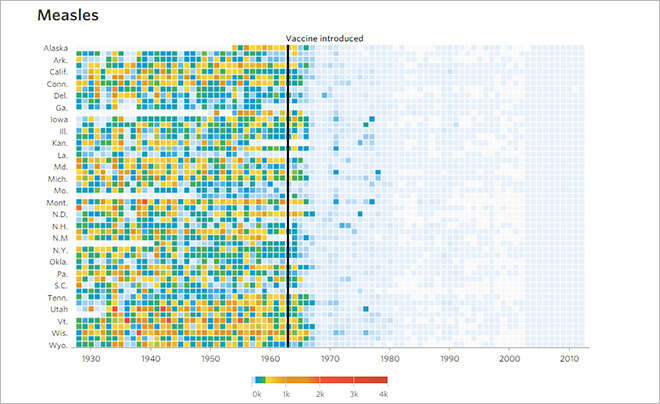 《华尔街日报》在2014年 2 月献上了这系列令人讶异的信息图,强调了疫苗对人类不可磨灭的功绩。在一些声音开始质疑疫苗安全的时候,这组 100,000 病例样本数据,展示了如果没有疫苗,世界将会非常的“色彩斑斓”。