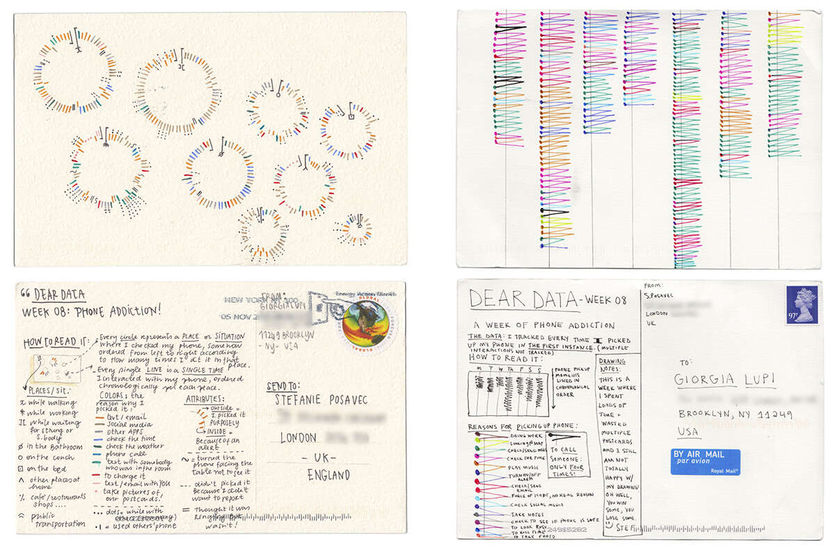 Giorgia Lupi 和 Stephanie Posavec 是两位数据可视化设计师。他们一个住在纽约,一个住在伦敦,而这个 Dear Data 项目是他们每周例行的一次“笔友会”:每周确定一个主题(或者说数据展现的方式),收集自己这周生活中出现的数字(开过的门,喝过的酒)然后把这些画成可视化数据的形式,寄给对方。
