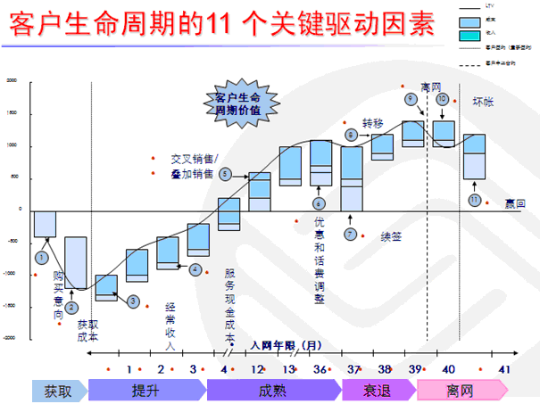 在电信业也存在客户生命周期的模型,存在11个关键驱动因素,然而尽管网络游戏产品与之在客户生命周期模型方面很像,但是二者存在一些非常大的差别。作为电信用户而言,在A阶段就存在购买倾向,也就是说电信行业在初期的用户获取方面就存在收益价值,如果成为某个品牌的用户,就必须进行付费购买,而这一点对于目前的网络游戏(道具收费)来说是最大的不同点,基于此,对于玩家生命周期价值的把握要根据产品具体来说。