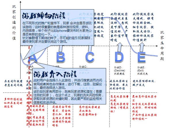 从这个模型来看,玩家处于不同的生命周期阶段,其对于游戏的价值和需求也是变化的,进而我们在对待玩家的问题上也要根据这个来确定,举个例子比如怎么推送不同玩家不同的活动,不同的道具,这就需要根据玩家处于的生命周期阶段来确定。在A~E五个时期,不同阶段的管理和目标是不同的,首先我们要获取玩家资源,其次通过核心玩法,交互甚至IB粘性(也就是投入金钱或者时间)留住用户,之后针对此阶段发生的不稳定因素,建立信息反馈机制,及时降低流失,提高留存,并使大批量用户进入稳定期,在稳定期促进玩家的成长,刺激玩家之间竞争,最后达到深度交互和融合,这时游戏的粘性培养起来了,也就是说稳定期可以被拉长,当然作为一个游戏产品,必然要面临流失问题,当流失发生剧烈时,我们就要考虑如何进行挽留玩家和使玩家回流的措施。