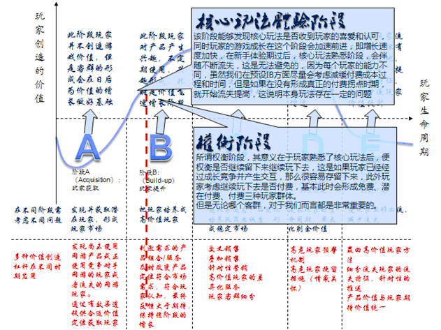 依据每个游戏的规划情况而言,新手期后会存在流失拐点,之后进入核心玩法呈现时期,这个时期玩家的精力集中在玩法上,这个时期对于玩家而言是比较漫长的,然而这个阶段是B阶段风险最高的阶段,当核心玩法熟悉后,玩家会面临抉择,是否玩下去,玩下去是否选择付费,这时存在两个拐点,一个付费拐点,一个是流失拐点。在此之后,基本上玩家进入下个时期,初步建立人际关系。