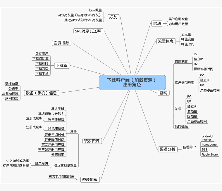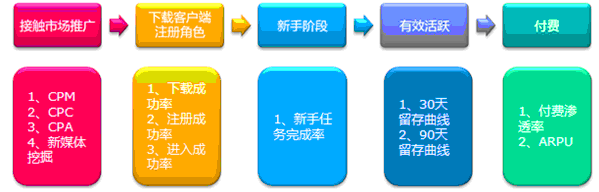 该模型是针对一个产品记录一批玩家从接触推广、关注、进入到形成付费(或者非付费)完整的关键数据链,其核心是有效活跃玩家的变化情况,有效活跃就是体验核心玩法,并最终留存在游戏的玩家,当然这是对于存在粘性的玩家而言的,同时模型要根据最初的倒入阶段反映留存,流失玩家的情况。