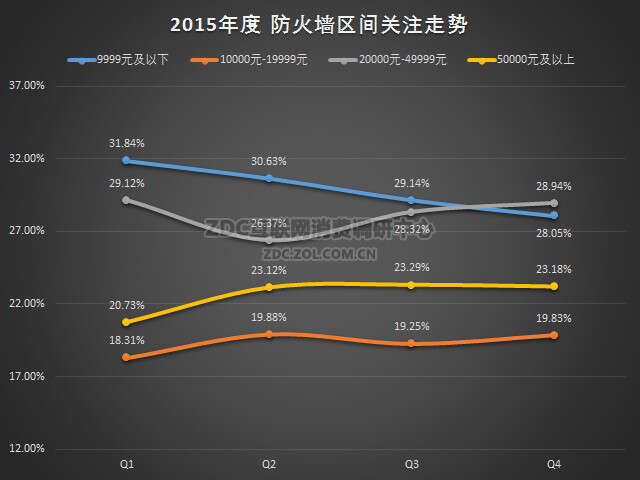 相比之下,基于我国用户需求特点的第二代防火墙可部署于不同的安全域之间,除具备传统防火墙的基本访问控制功能之外,还具备应用层访问控制、用户控制、Web攻击防护、信息泄露防护、深度内容检测、高性能等特征。而且它可实现架构上一次解包完成全部检查,突破了性能瓶颈;再结合其高效、可视化、易管理等特性,成为取代传统安全产品的新趋势。那么在2015年,中国用户对防火墙硬件市场的关注走势如何呢?一起来看下ZDC发布的统计数据吧。