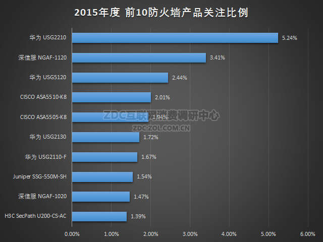 从防火墙产品的关注比例可以看出,在前10排名榜中,华为产品有4款型号上榜,思科有2款,深信服有2款,Juniper和H3C各占1款。对比去年同期,华为USG2210仍旧处于领跑地位,而深信服NGAF-1120则成功杀入10强,在取代了去年的思科ASA5505后,排在第二位置。