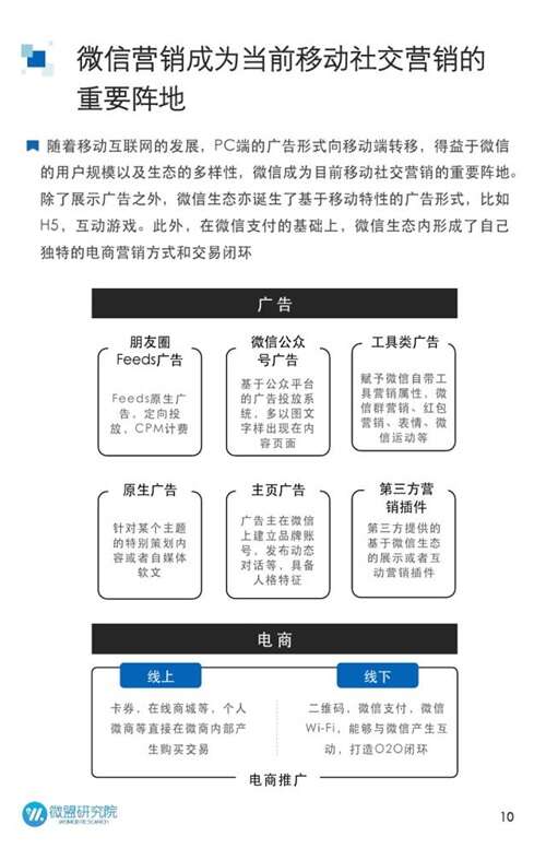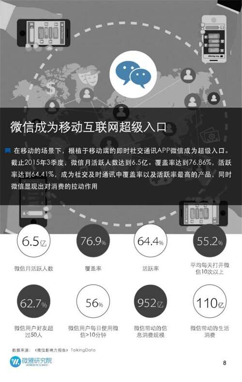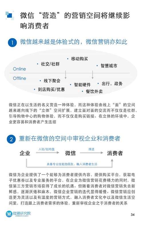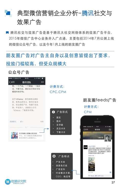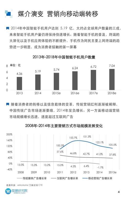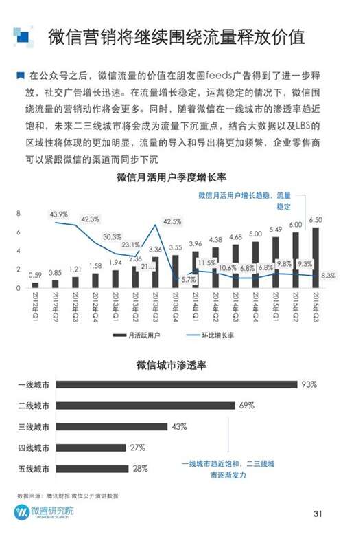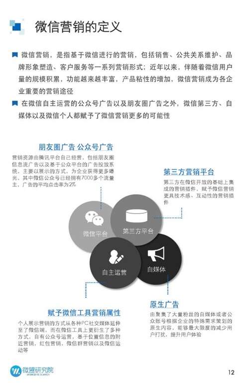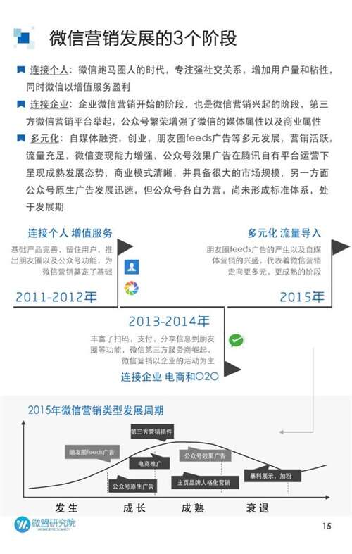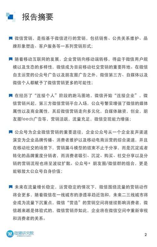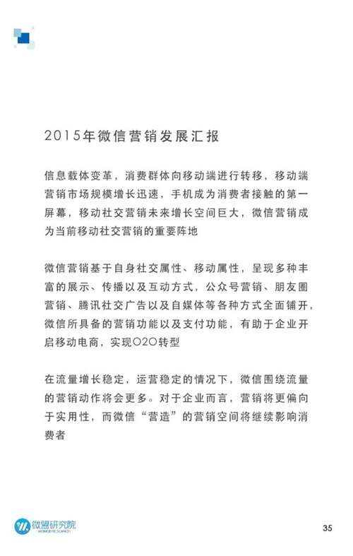 微盟:2015年微信营销研究报告 微盟近日发布了《2015年微信营销研究报告》,分别从微信营销发展环境、微信营销基础概述、2015年企业微信营销发展现状、典型的企业分析以及2015-2016年微信营销发展趋势等五大方面对微信营销进行了全面阐述。以下是报告全文: 更多阅读:微盟研究院:2015年微信营销研究报告中国信息通信研究院:2015年中国信息经济研究报告阿里研究院:2015年网商发展研究报告微盟:2015年Q1中国微商行业报告Topdigital&妈妈帮:2015年中国母婴互联网营销新思维与新趋势快消品品牌如何做好微信营销–信息图微信营销分析品牌微信营销驶入“快车道”CNNIC:2015年第37次中国互联网络发展状况统计报告–个人互联网应用发展状况(九)艾漫:2015年Q2娱乐数据季报武书连:2015年中国大学排行榜蚂蜂窝:2015年全球旅游购物报告2015年在线教育用户行为调查报告2015年留美中国学生现状白皮书联合国儿童基金会:2015年世界儿童状况