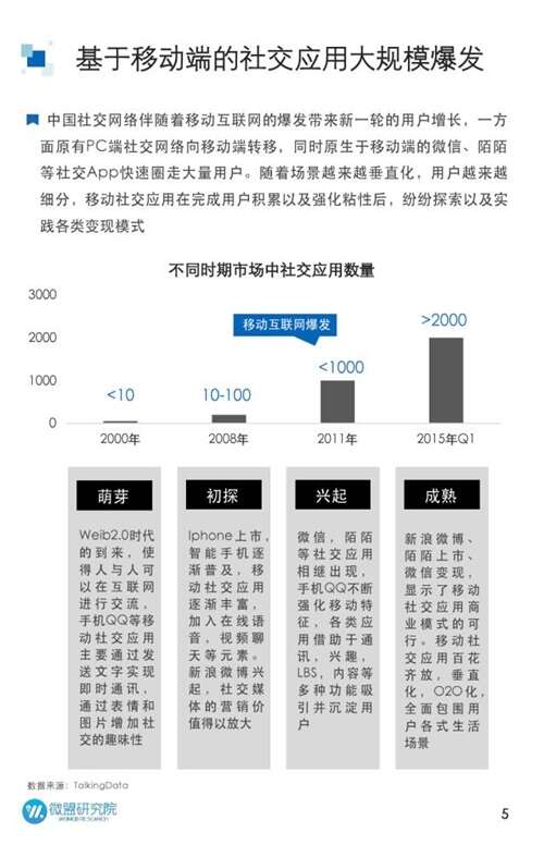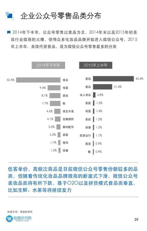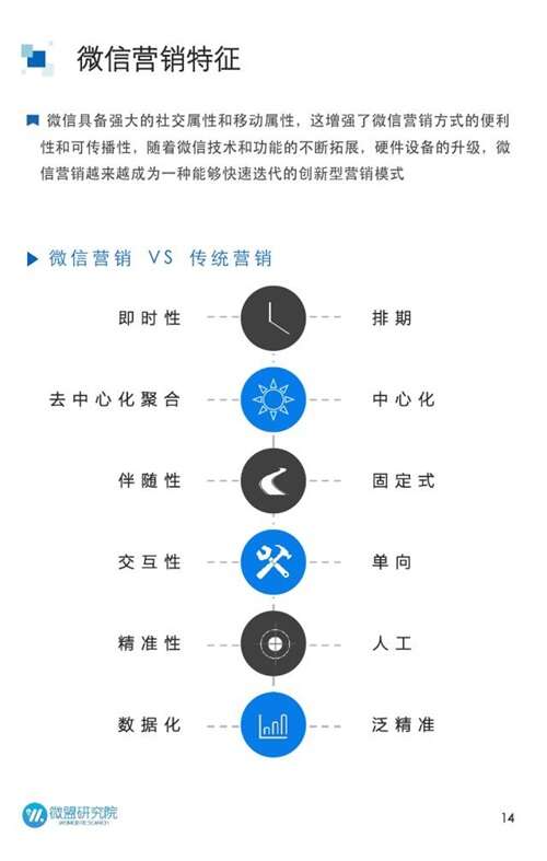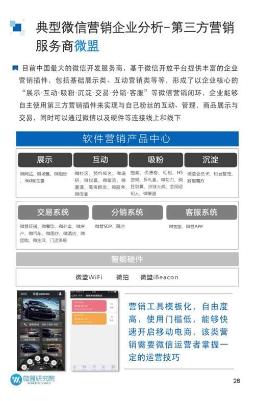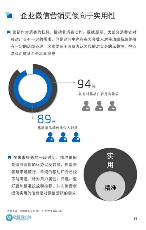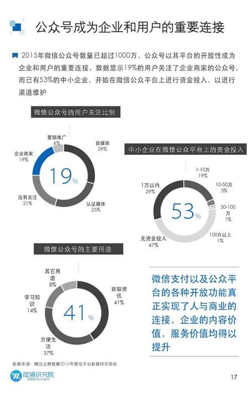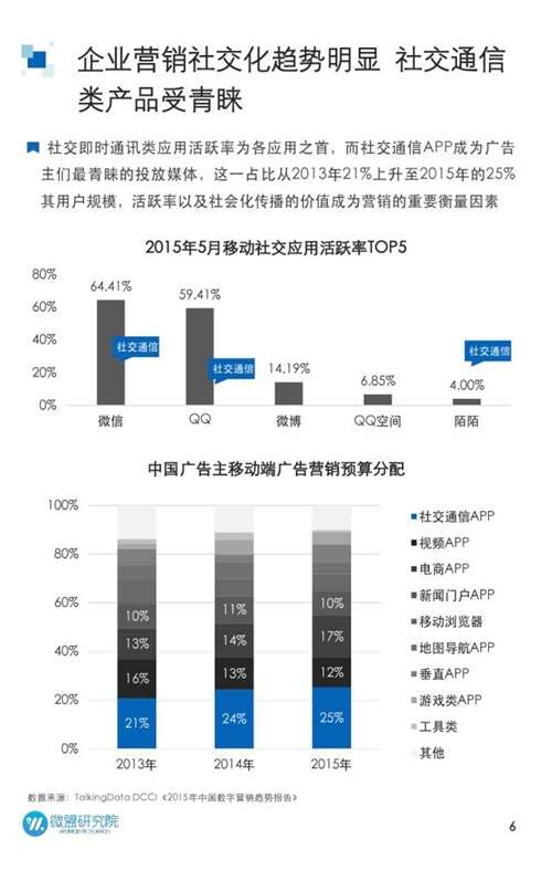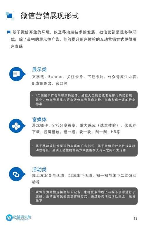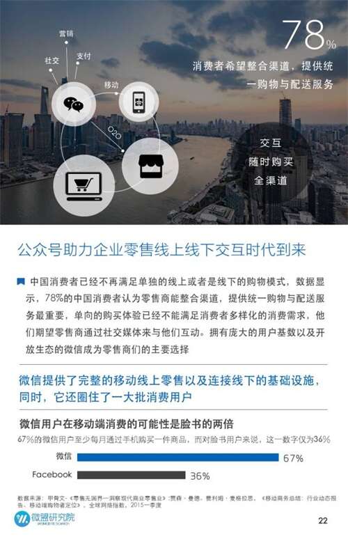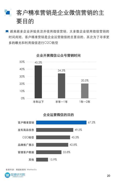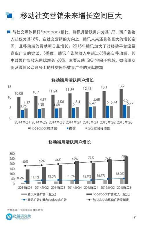 微盟:2015年微信营销研究报告 微盟近日发布了《2015年微信营销研究报告》,分别从微信营销发展环境、微信营销基础概述、2015年企业微信营销发展现状、典型的企业分析以及2015-2016年微信营销发展趋势等五大方面对微信营销进行了全面阐述。以下是报告全文: 更多阅读:微盟研究院:2015年微信营销研究报告中国信息通信研究院:2015年中国信息经济研究报告阿里研究院:2015年网商发展研究报告微盟:2015年Q1中国微商行业报告Topdigital&妈妈帮:2015年中国母婴互联网营销新思维与新趋势快消品品牌如何做好微信营销–信息图微信营销分析品牌微信营销驶入“快车道”CNNIC:2015年第37次中国互联网络发展状况统计报告–个人互联网应用发展状况(九)艾漫:2015年Q2娱乐数据季报武书连:2015年中国大学排行榜蚂蜂窝:2015年全球旅游购物报告2015年在线教育用户行为调查报告2015年留美中国学生现状白皮书联合国儿童基金会:2015年世界儿童状况