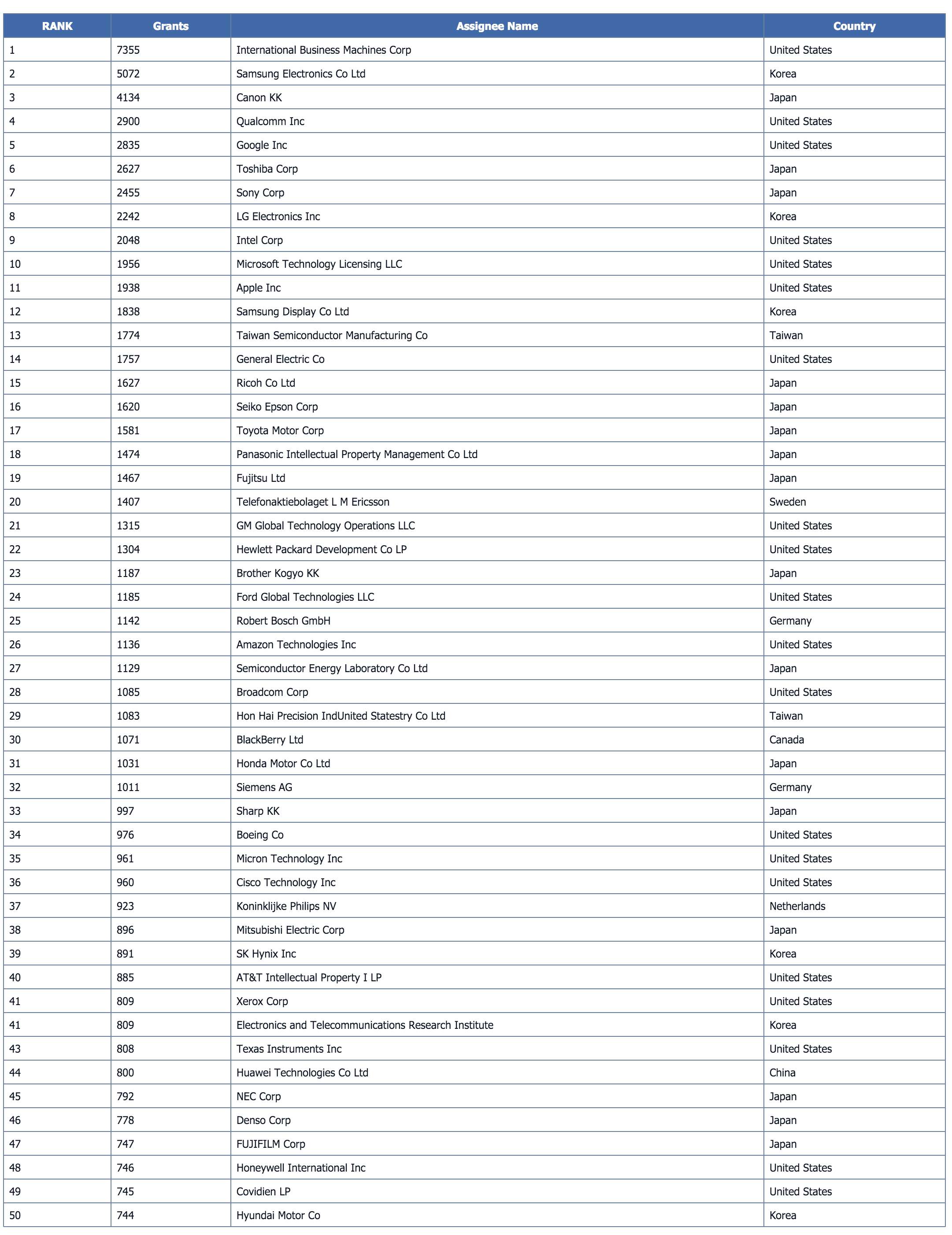 报告显示,2015年美国共授予298407项实用专利,略低于2014年的授予量。其中IBM获得7355项,继续排名首位,而三星和佳能分居第二和第三位。