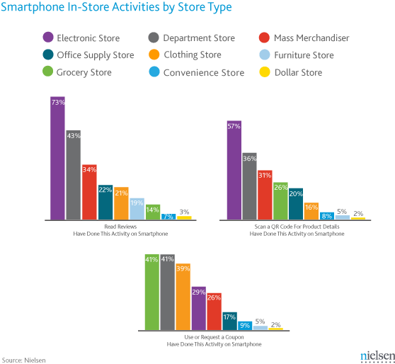 依此结果来看,似乎消费价格越高,人们越可能运用手机来辅助消费。另一种可能的解释则为,购买电子产品的人比起其他消费族群,较熟悉智能型手机的使用。值得注意的是,虽然似乎对大部份的购物者而言,价格高低是花功夫进行额外研究的原因,但是购买家具的消费者却只有19%的人会事先查看评比,更只有5%的人会扫描QR码。