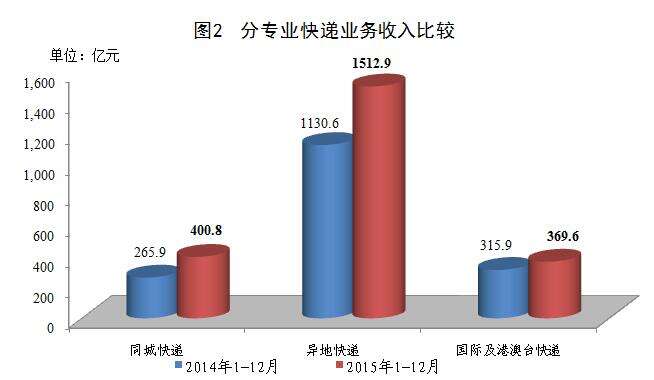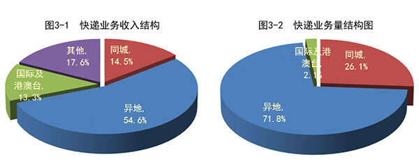 2015年,同城、异地、国际及港澳台快递业务收入分别占全部快递收入的14.5%、54.6%和13.3%;业务量分别占全部快递业务量的26.1%、71.8%和2.1%。与去年同期相比,同城快递业务收入的比重上升1.5个百分点,异地快递业务收入的比重下降0.7个百分点,国际及港澳台业务收入的比重下降了2.1个百分点。