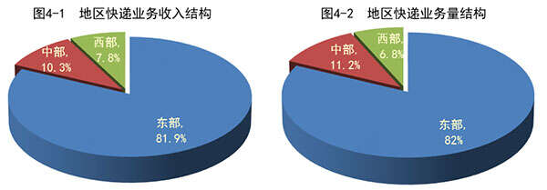 2015年,东、中、西部地区快递业务收入的比重分别为81.9%、10.3%和7.8%,业务量比重分别为82%、11.2%和6.8%。与去年同期相比,东部地区快递业务收入比重下降了0.9个百分点,快递业务量比重与去年持平;中部地区快递业务收入比重上升了0.9个百分点,快递业务量比重上升了0.6个百分点;西部地区快递业务收入比重与去年持平,快递业务量比重下降了0.6个百分点。