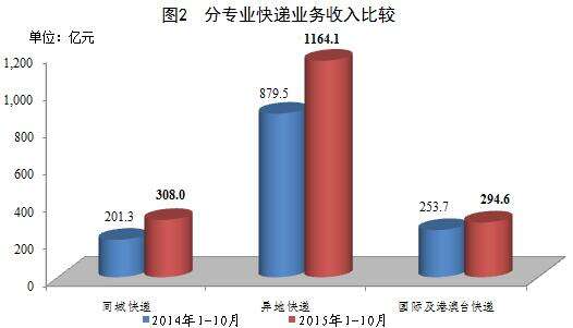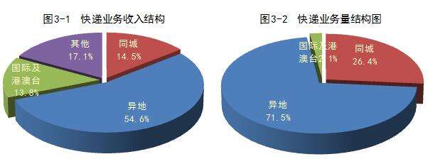 1-10月,同城、异地、国际及港澳台快递业务收入分别占全部快递收入的14.5%、54.6%和13.8%;业务量分别占全部快递业务量的26.4%、71.5%和2.1%。与去年同期相比,同城快递业务收入的比重上升1.8个百分点,异地快递业务收入的比重下降0.6个百分点,国际及港澳台业务收入的比重下降了2.1个百分点。