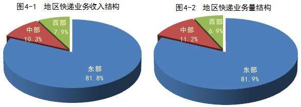 1-10月,东、中、西部地区快递业务收入的比重分别为81.8%、10.3%和7.9%,业务量比重分别为81.9%、11.2%和6.9%。与去年同期相比,东部地区快递业务收入比重下降了1.1个百分点,快递业务量比重持平;中部地区快递业务收入比重上升了0.9个百分点,快递业务量比重上升了0.5个百分点;西部地区快递业务收入比重上升了0.2个百分点,快递业务量比重下降了0.5个百分点。