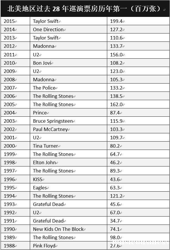 2014年小霉霉(Taylor Swift)推出了自己的《1989》专辑,2015年她举办了最大规模的世界巡演,仅是票房就获得了2.5亿美元。在北美地区霉霉取得了1.994亿美元的票房成绩,超过2005年滚石乐队以1.62亿美元的票房创下的记录。现在,历史已经改写,霉霉登顶,滚石乐队退居北美地区第二。