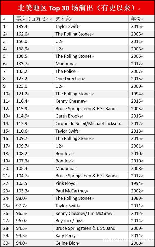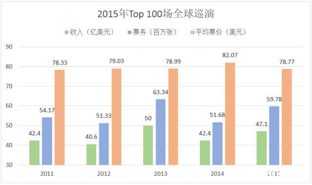 1、全球Top 100场巡演收入47.1亿美元,与2014年相比上涨了11%,不过低于2013年的50亿美元收入。