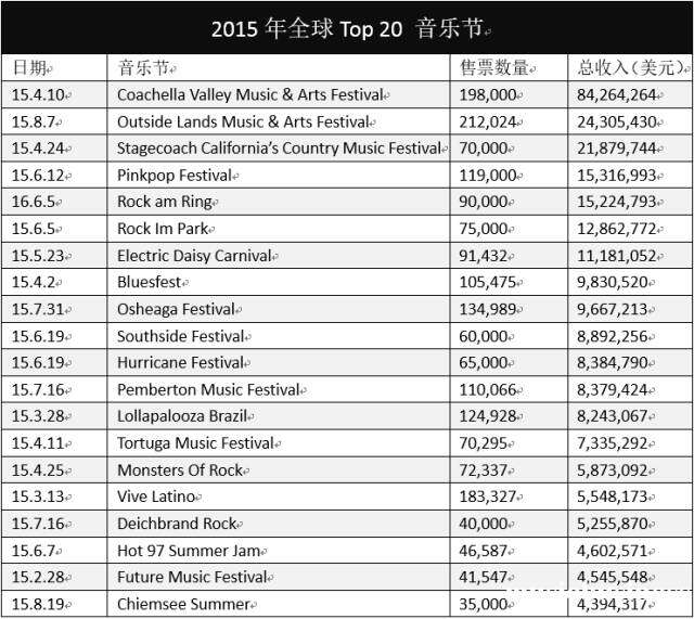 2、2015年全球Top 100场巡演共卖出了5978万张门票,与2014年相比上涨16%,但低于2015年的6334万张。