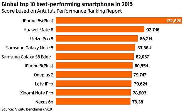 2015年1月15日专门测试iOS和安卓手机性能的专业软件安兔兔发布最新榜单,评选出2015年性能最佳的智能手机,其中苹果iPhone 6s得分遥遥领先,多款国产智能手机上榜。
