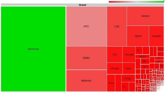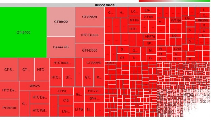 而且,正如你所预期的,在所有的3997个机型中,三星的Galaxy S II成为了最大的赢家,在上述的681,900个设备中占到61,389部。而三星的其他设备在用户中的使用度也很高,远远超过了其他机型。所以,这里就出现另一个问题,那些其他厂商的其他机型该怎样瓜分剩下的那部分用户呢?