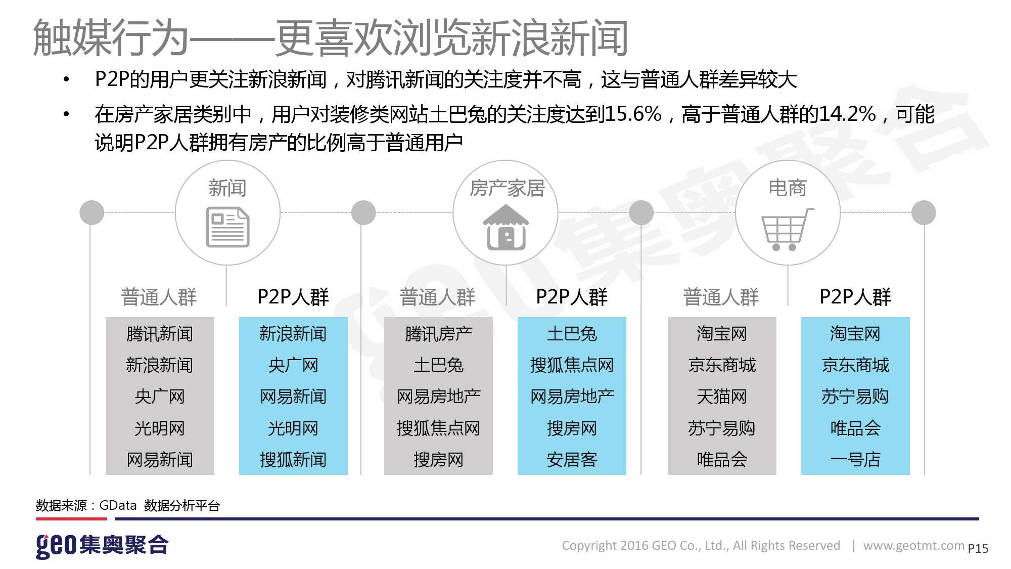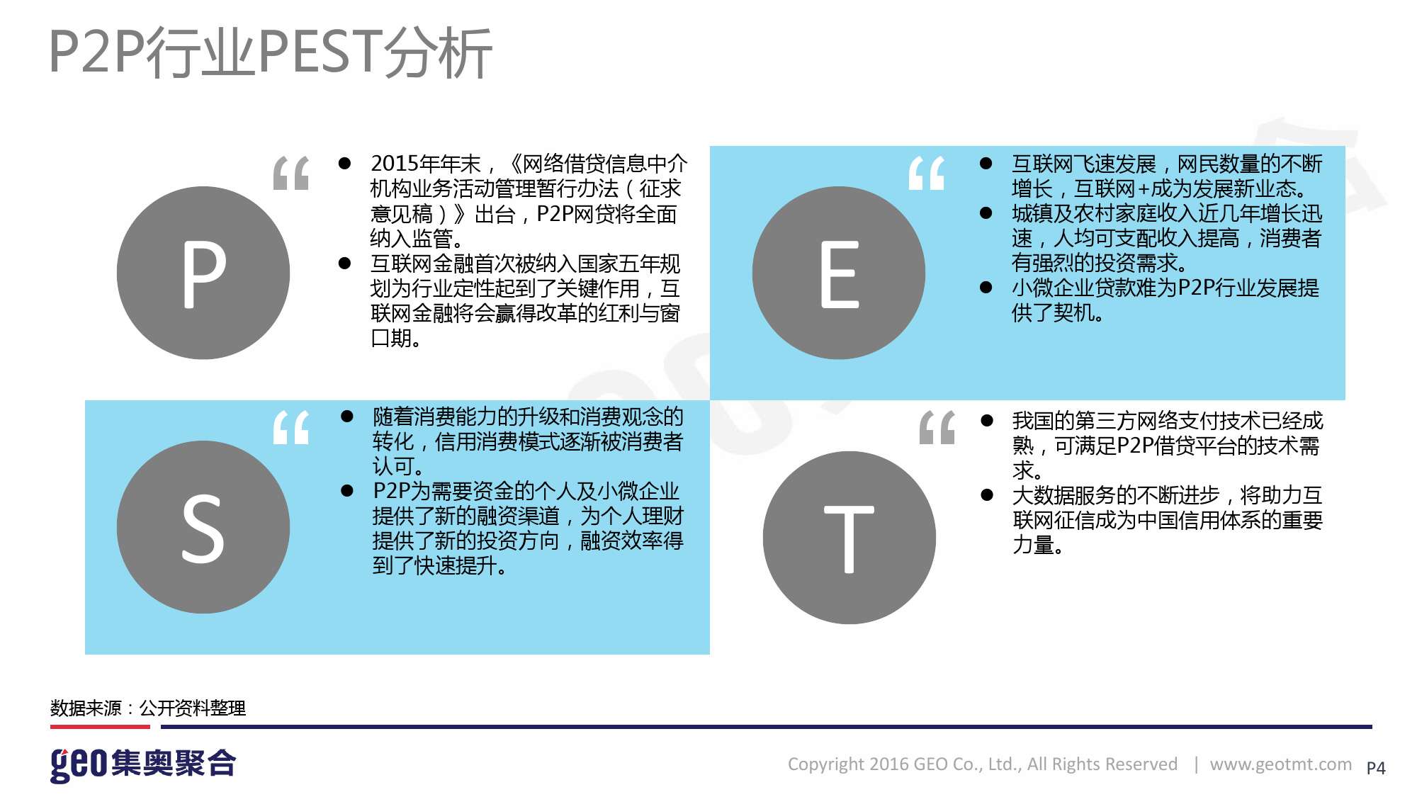 GEO:2015年P2P行业总结报告 更多阅读:GEO:2015年P2P行业的冰火两重天GEO:2015年P2P人群洞察报告GEO:研究显示P2P人群都爱逛房产旅游以及奢侈品网站360:2015年第二季度P2P行业研究报告网贷之家:2018年5月P2P网贷行业月报网贷之家:2018年4月P2P网贷行业月报中国金融不良资产市场调查报告:P2P平台风险较高P2P网贷行业投资人流失率报告P2P鼻祖LendingClub最透彻的分析网贷之家:2016年2月全国P2P平台百强榜网贷之家:2015年P2P网贷行业报告FICO:调查显示仅有不足1%的美国人使用P2P贷款产品P2P行业新锐洞察 :角色转变与风险如何塑造P2P行业零壹研究院:2015年7月全国P2P平台CAMIA:为什么印尼的独角兽能通过p2p业务在印尼吸睛(金)