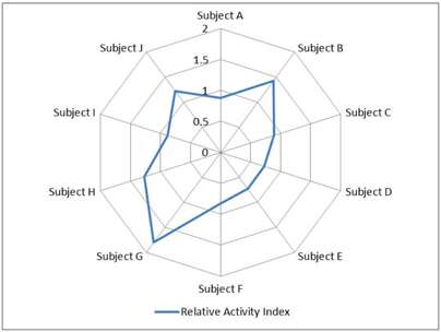 现在我们可以用雷达图来比较相对活跃指数,并着重观察指数最高/最低的研究领域。例如,此机构在 G 领域的相对活跃指数最高(1.8),但是,此领域的全球总量远远小于其他领域(见图 3 )。雷达图的另一个局限是,它暗示各轴之间存在关系,而在本案例中这关系并不存在(各领域并不相互关联)。