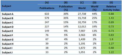 在这个例子中,我们想了解此机构在各个领域发表了多少文章。出版数量是一个有用的指标,不仅如此,与下面这些指标对照会呈现出更多信息: