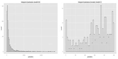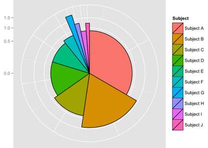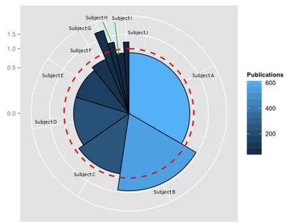 我们可以把出版量和活跃程度在同一个图表中展示,以理解各领域的活跃程度。使用图 4 的玫瑰图,各块的面积表示文章数量,半径长短表示相对活跃指数。注意在此例中,半径轴是二次的(而图3中是典型线性的)。图中可以看出,B 领域十分突出,拥有最大的数量(由面积表示)和最高的相对活跃程度(由半径长度表示)。