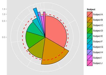 用肉眼衡量半径长度可能并不容易。由于在本例中,相对活跃指数的1.0代表此领域的全球活跃程度,我们可以通过给出1.0的参照值来引导读者,见图5。这样很容易看出哪些领域的半径超出参考线。