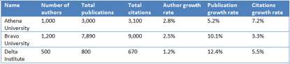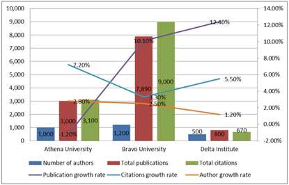 清晰的问题可以有助于避免数据可视化的一个常见毛病:把不相干的事物放在一起比较。假设我们有这样一个数据集(见表1),其中包含一个机构的作者总数、出版物总数、引用总数和它们特定一年的增长率。图1是一个糟糕的可视化案例,所有的变量都被包含在一张表格中。在同一张图中绘制出不同类型的多个变量,通常不是个好主意。注意力分散的读者会被诱导着去比较不相干的变量。比如,观察出所有机构的作者总数都少于出版物总数,这没有任何意义,又或者发现 Athena University、Bravo University、Delta Institution 三个研究机构的出版物总数依次增长,也没有意义。拥挤的图表难以阅读、难以处理。在有多个Y轴时就是如此,哪个变量对应哪个轴通常不清晰。简而言之,槽糕的可视化项目并不澄清事实而是引人困惑。