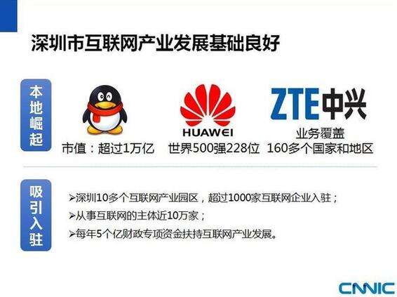 深圳市互联网产业发展活跃、聚集效益优质,不仅培育出华为、中兴、腾讯等电子信息制造及互联网巨头,还吸引了百度、阿里巴巴等互联网企业入驻。在深圳10多个互联网产业园区,入驻的互联网企业超过1000家。
