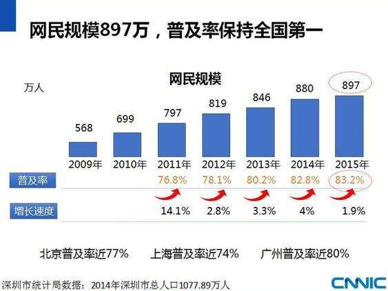 截至2015年12月底,深圳总体网民规模达到897万,网民渗透率高达83.2%,与全国平均水平相比高出30个百分点以上,与2014年相比,网民规模仍然在高位上增加1.9个百分点。