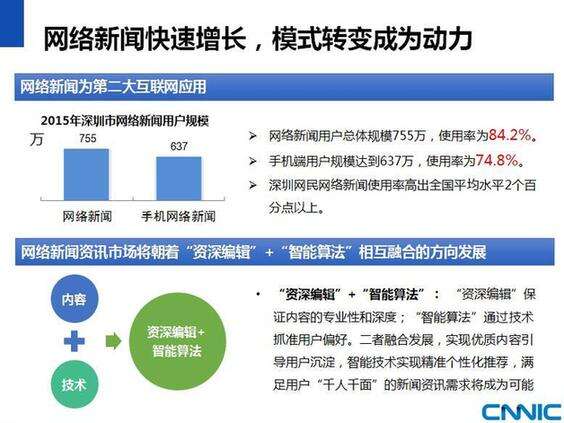 截至2015年12月,深圳市使用网络新闻的网民规模为755万人,使用率达到84.2%,高出全国平均水平2个百分点以上。 深圳市使用搜索引擎的网民规模为736万人,使用率为82%,与2014年相差不多。