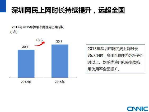 深圳网民平均每周上网时长35.7个小时,与全国平均水平相比高出9个小时以上。