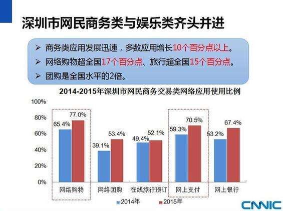 深圳网络购物带动网上支付和网上银行应用的发展,二者的网民规模为633万和604万,使用率分别为70.5%和67.4%,较2014年分别提升11.2和14.2个百分点。