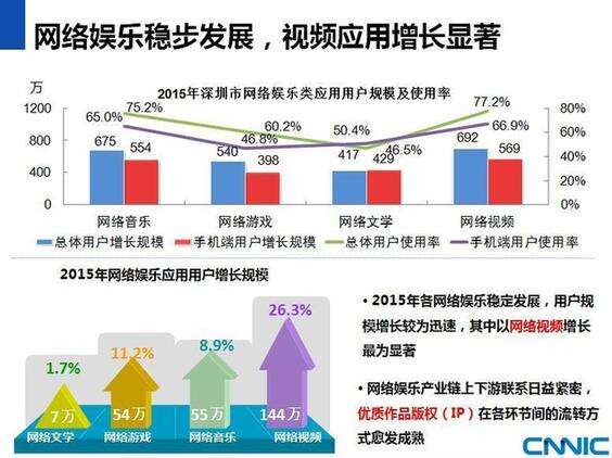 网络音乐和网络视频的用户规模分别为675万人和692万人,使用率达到75.2%和77.2%,较2014年提升4.8和14.9个百分点。网络游戏和网络文学的网民规模分别为540万人和417万人,使用率达到60.2%和46.5%。