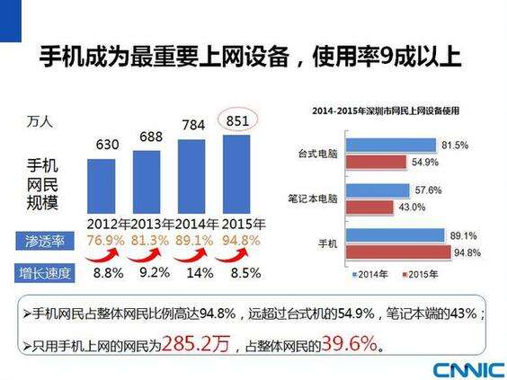 2015年,深圳市手机网民规模达到851万人,较2014年增长67万,增长率为8.5%。深圳网民使用手机上网的比例为94.8%,与全国平均水平相比高出近5个百分点。
