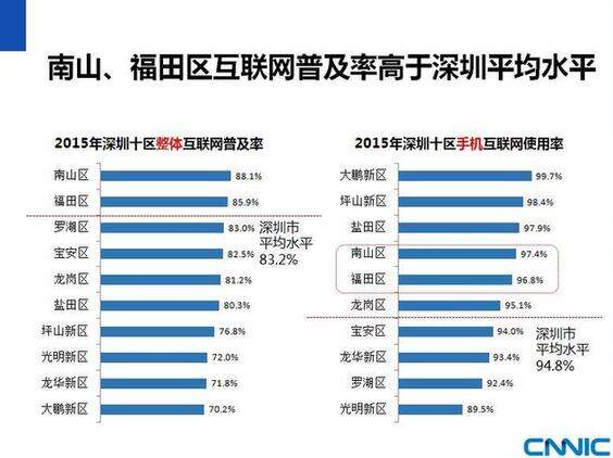 深圳互联网普及率位居全国第一,在全球也处于领先水平。截至2015年12月底,深圳总体网民规模达到897万,网民渗透率高达83.2%,与全国平均水平相比高出30个百分点以上;深圳市手机网民规模达到851万人,使用手机上网的比例为94.8%,与全国平均水平相比高出近5个百分点。