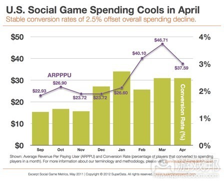SuperData最近报告显示,4月份美国社交游戏付费玩家平均在游戏中消费37.59美元,比2011年同一时期的45.58美元下降8美元。