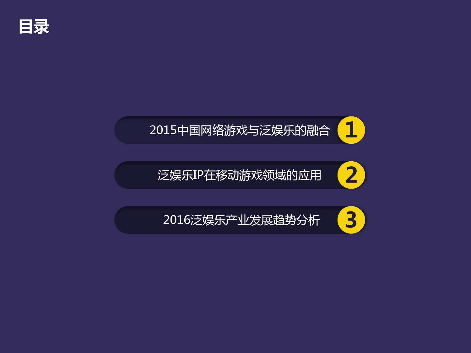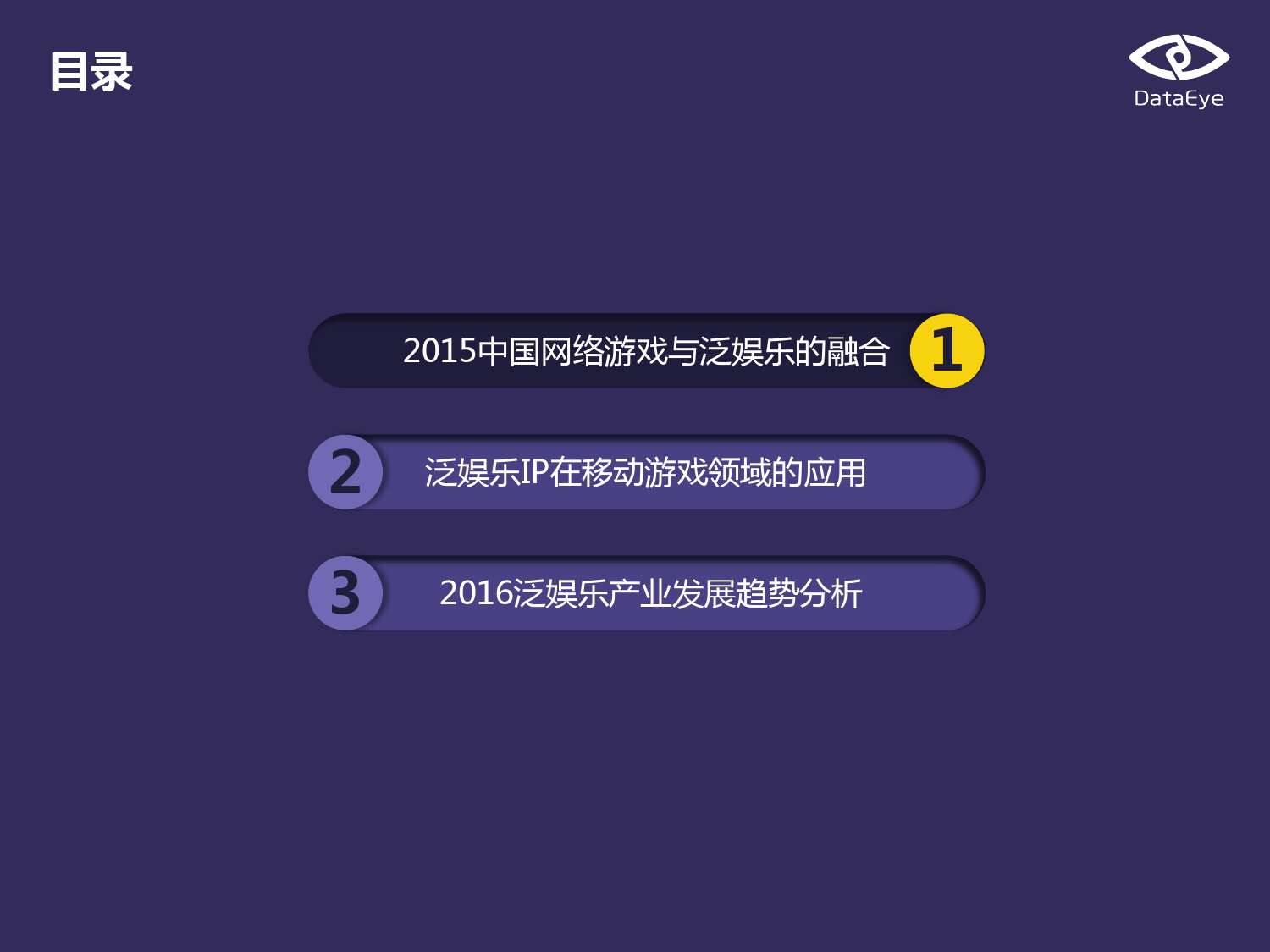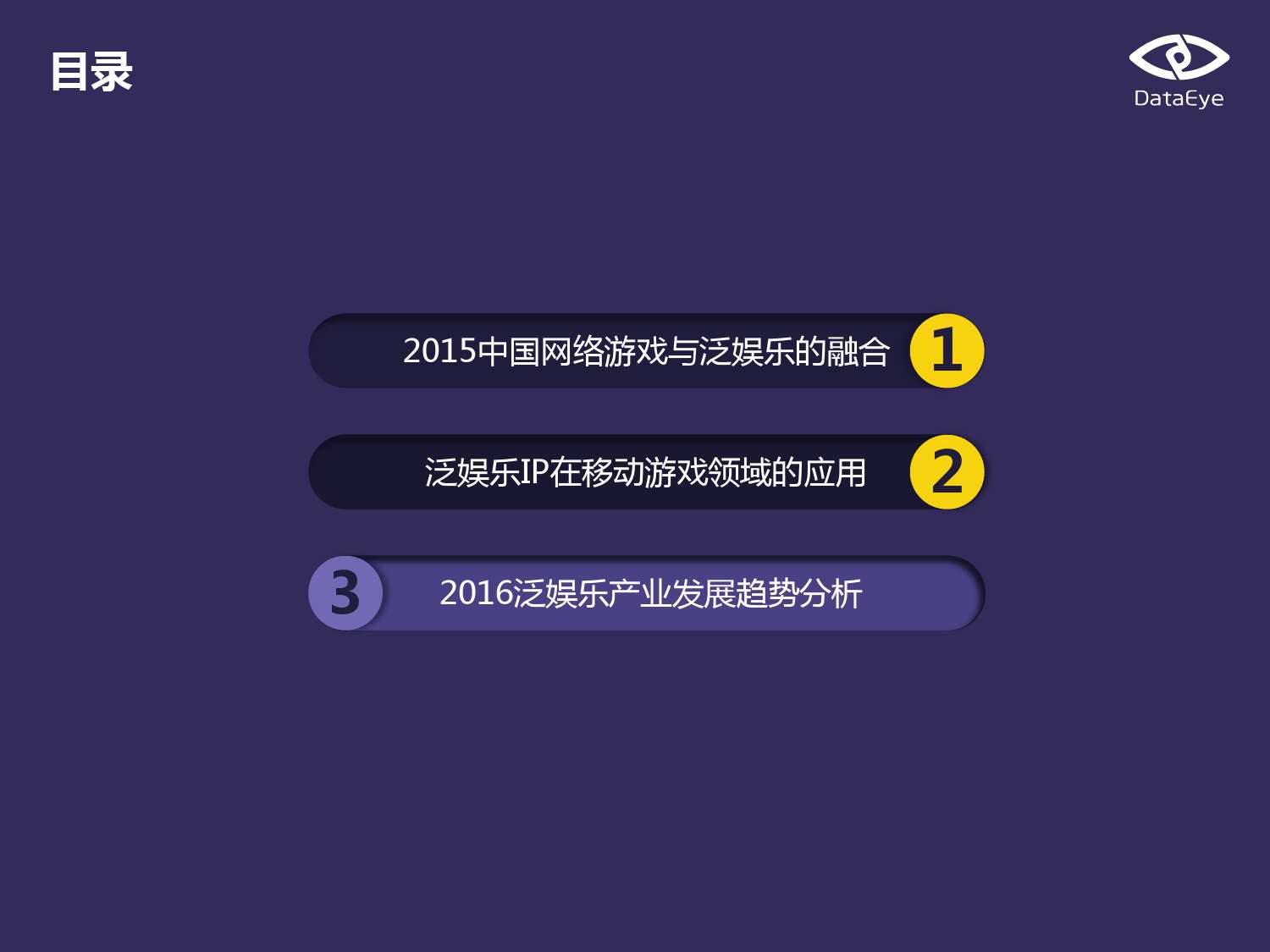 DataEye:泛娱乐开启游戏行业新时代 更多阅读:DataEye:2015年泛娱乐白皮书热云数据:2018-2019移动互联网泛娱乐行业特征报告2016全面爆发的泛娱乐研究分析2015年泛娱乐核心产业规模4229亿DataEye:2020移动游戏全年买量白皮书DataEye:2020年10月份手游买量报告DataEye:2020半年度二类电商广告投放白皮书DataEye:2020年移动游戏半年度买量白皮书DataEye:2019二类电商广告投放白皮书DataEye:2019移动游戏全年买量白皮书DataEye:2019移动游戏半年度买量白皮书DataEye:2016年1月中国手机游戏新品洞察报告DataEye:2015年Q4 手游新品洞察报告DataEye:2015年Q3 HTML5游戏数据报告DataEye:2015年中国手游市场新品洞察报告