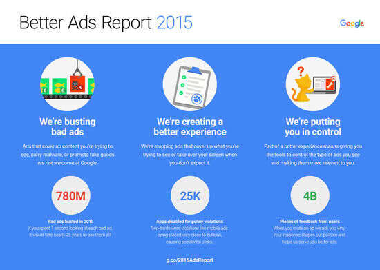 因此减少广告对用户体验的破坏,成了 Google 最看重的事情,去年就针对手机推出了试玩 60 秒等互动广告。而这些试验性的广告形式要取得效果,加大力度清理垃圾广告是第一步。