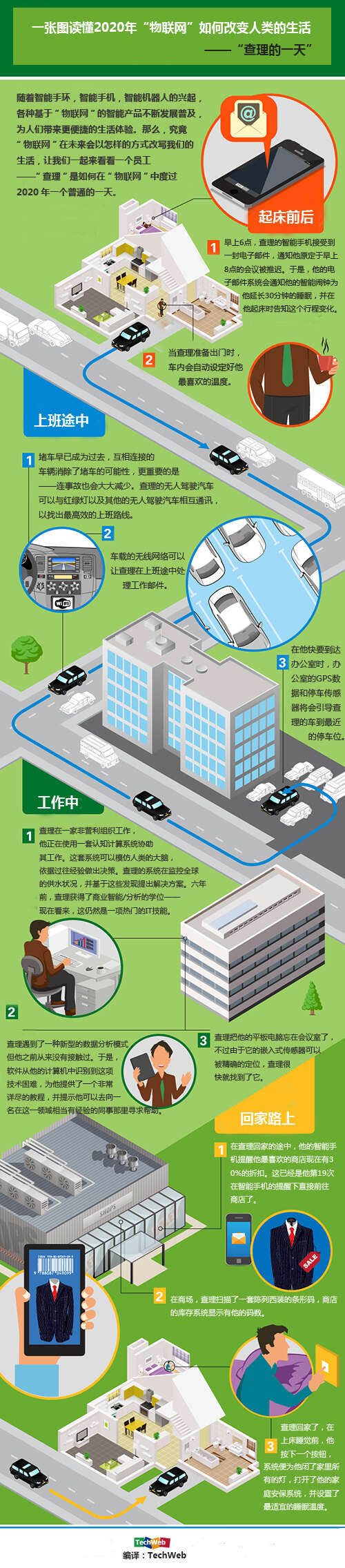 “物联网”(Internet of things)——听上去是一个新鲜又时髦的词汇,但实际上它已经不再是一个遥远的话题。根据Gartner的预测,到2020年将会有73亿部智能手机、平板电脑和PC电脑陪伴着我们的生活。随着智能手环,智能手机,智能机器人的兴起,各种基于该技术的智能产品不断发展、普及,为人们带来更便捷的生活体验。那么,究竟“物联网”在未来会以怎样的方式改写我们的生活,让我们一起来看看外媒所描述的一个2020年的普通员工“查理”——是如何在“物联网”中度过一个普通的一天。