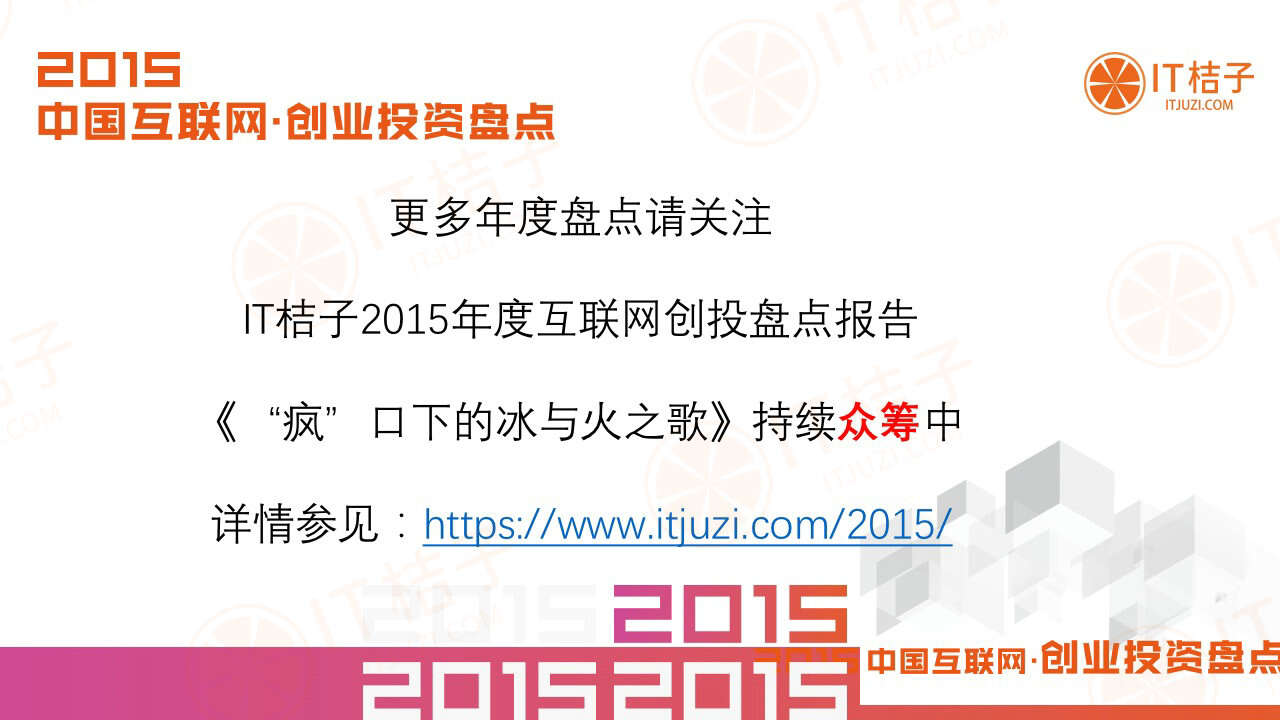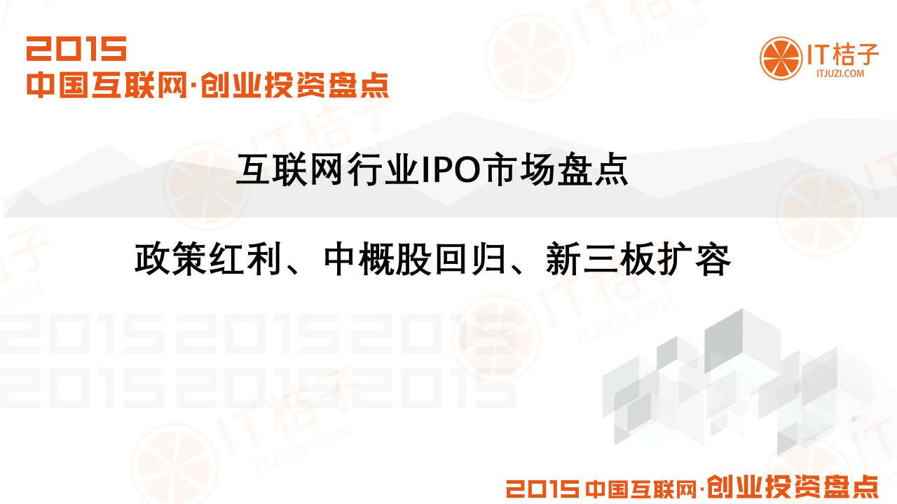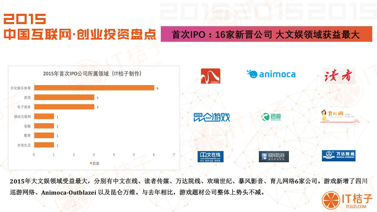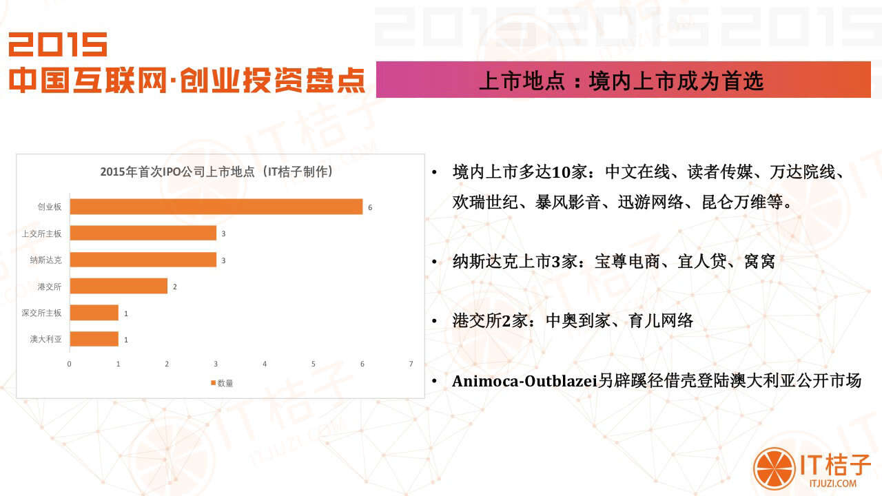 IT桔子:2015年互联网行业IPO上市盘点 更多阅读:IT桔子:2016年Q1中国互联网创业投资分析报告IT桔子:2015年中国互联网领域投资格局盘点IT桔子:2016年互联网体育创投发展白皮书IT桔子:2015年度企业服务创业与投资盘点IT桔子:2015年创业格局盘点之互联网金融领域大公司布局IT桔子:2015年创业格局盘点之去向何方(下)IT桔子:2015年度机构退出榜单盘点IT桔子:医疗行业垂直 VC 研究it桔子:2022年中国新晋 83 家独角兽企业 美国稍多几家网易云& IT桔子发布2018独角兽榜单:共186家,北上杭深占83%IT桔子:2015年SAAS服务创投观察阿维塔科技:2025年H1收入122.08亿元,同比增长98.5%企查查:2025年H1毛利率90.74%,拟募资15亿元京东工业:2024年中国工业供应链市场占有率4.1%本源量子:2025年Q1营收2858.44万元,净亏损1787.40万元
