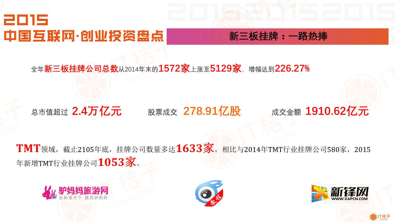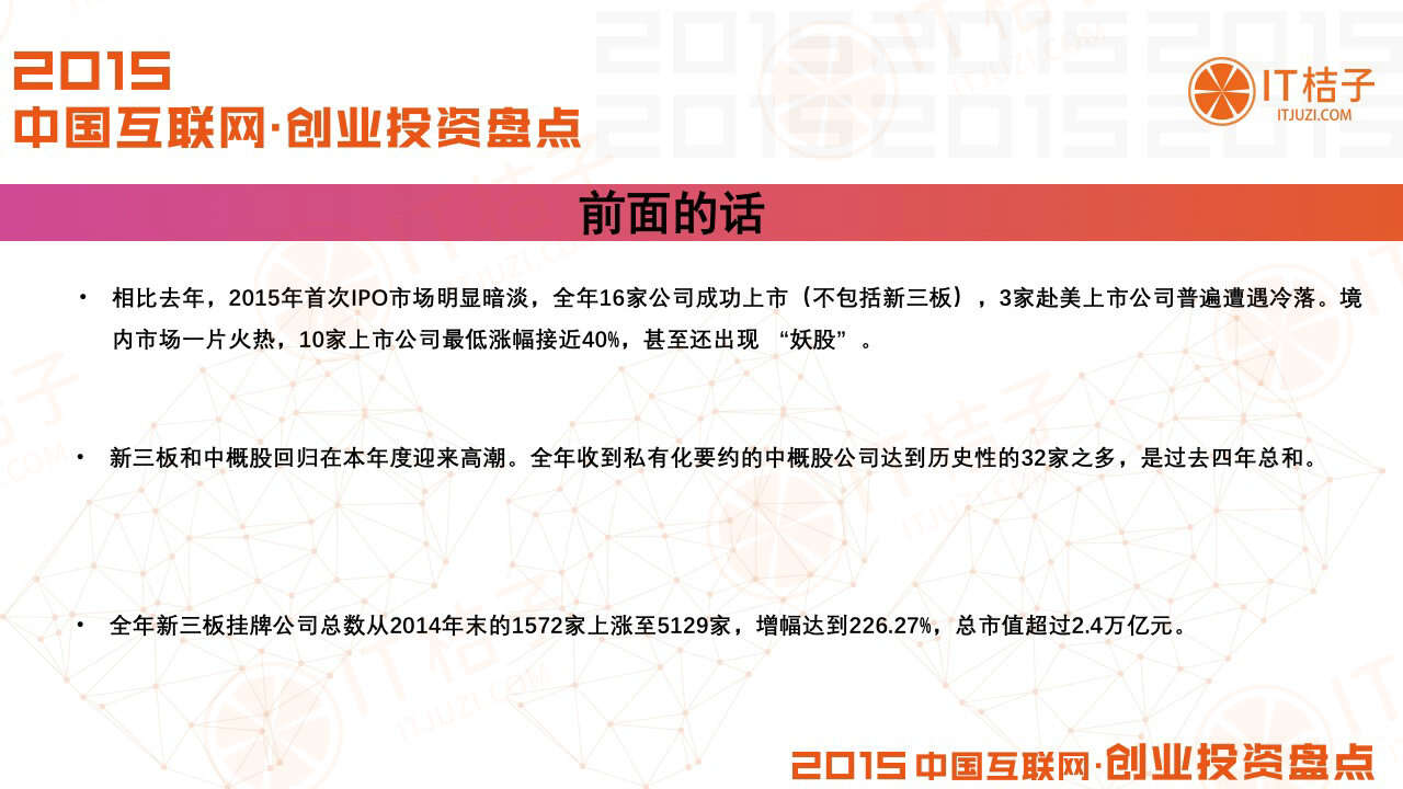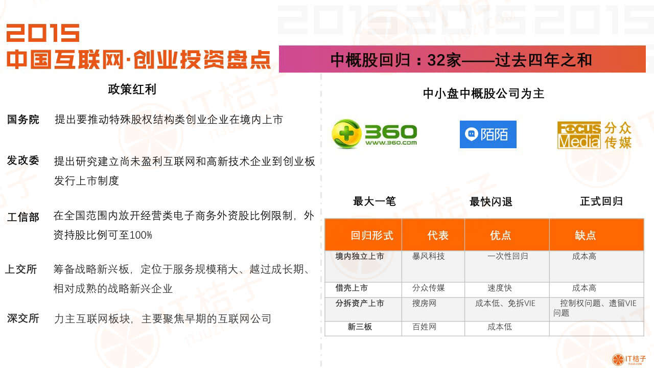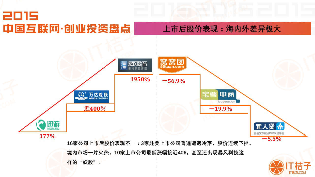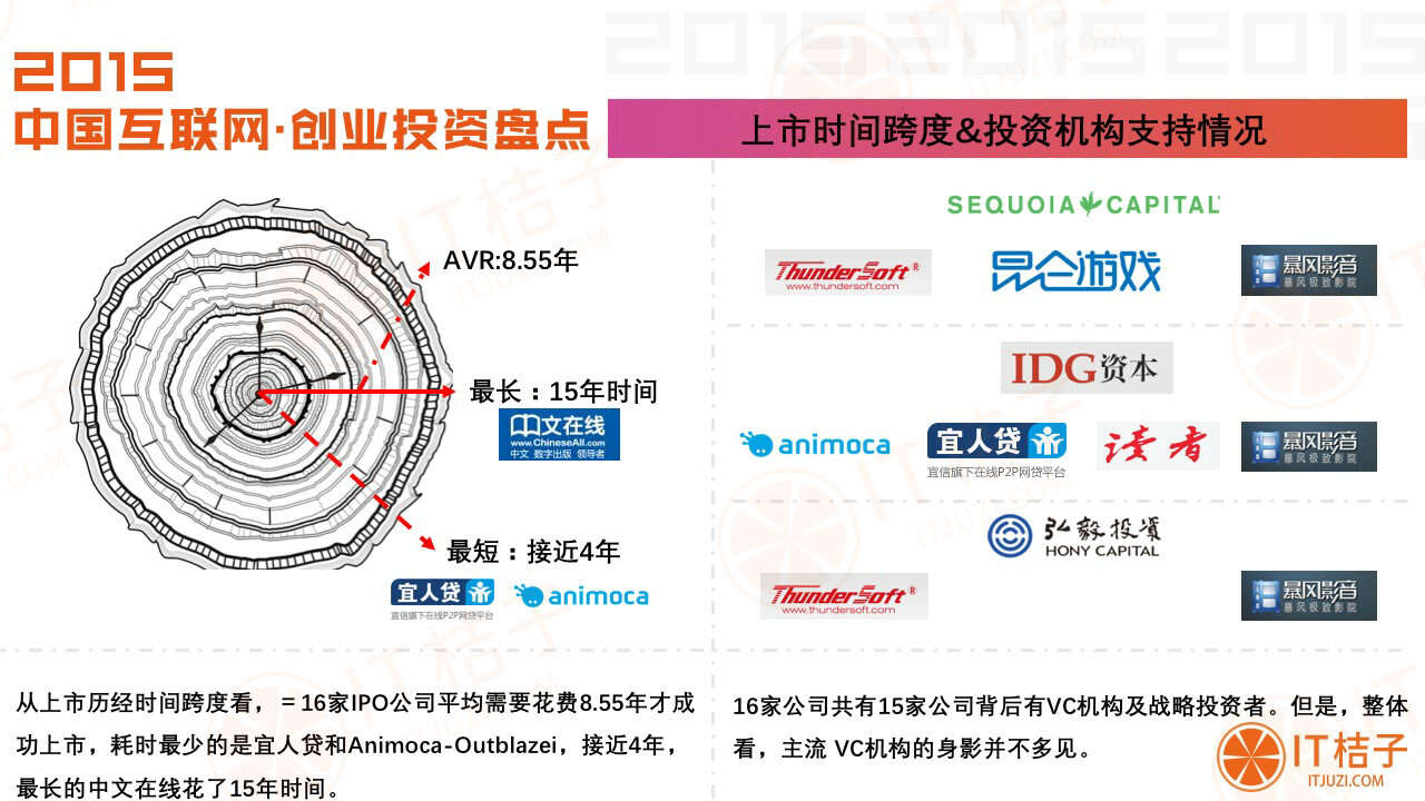 IT桔子:2015年互联网行业IPO上市盘点 更多阅读:IT桔子:2016年Q1中国互联网创业投资分析报告IT桔子:2015年中国互联网领域投资格局盘点IT桔子:2016年互联网体育创投发展白皮书IT桔子:2015年度企业服务创业与投资盘点IT桔子:2015年创业格局盘点之互联网金融领域大公司布局IT桔子:2015年创业格局盘点之去向何方(下)IT桔子:2015年度机构退出榜单盘点IT桔子:医疗行业垂直 VC 研究it桔子:2022年中国新晋 83 家独角兽企业 美国稍多几家网易云& IT桔子发布2018独角兽榜单:共186家,北上杭深占83%IT桔子:2015年SAAS服务创投观察阿维塔科技:2025年H1收入122.08亿元,同比增长98.5%企查查:2025年H1毛利率90.74%,拟募资15亿元京东工业:2024年中国工业供应链市场占有率4.1%本源量子:2025年Q1营收2858.44万元,净亏损1787.40万元