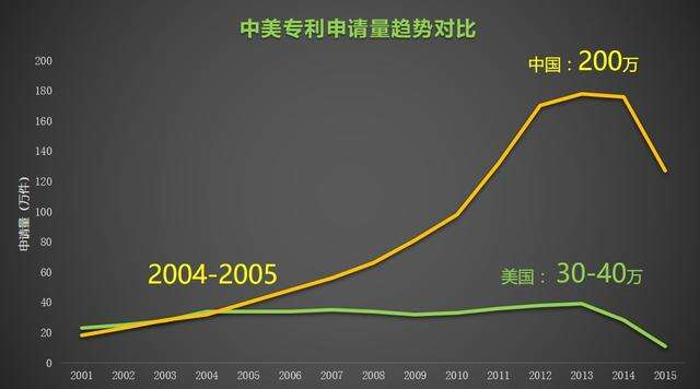 违反公众常识的第一点是,中国专利申请早在2006之前就已经全面超越美国,美国专利在十年间维持了小幅的上涨,申请量年均30-40万件。而中国在2014年超过200万件的申请量,位居全球第一。