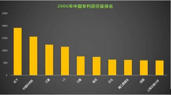如果在2006年,我们将中美两国进行混合排名,那你看到的仍然是“美国专利获得排名”榜,没有中国厂商有实力与美国公司进行PK。