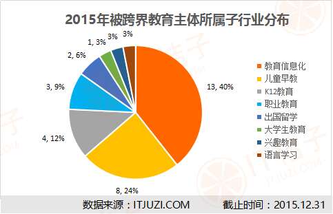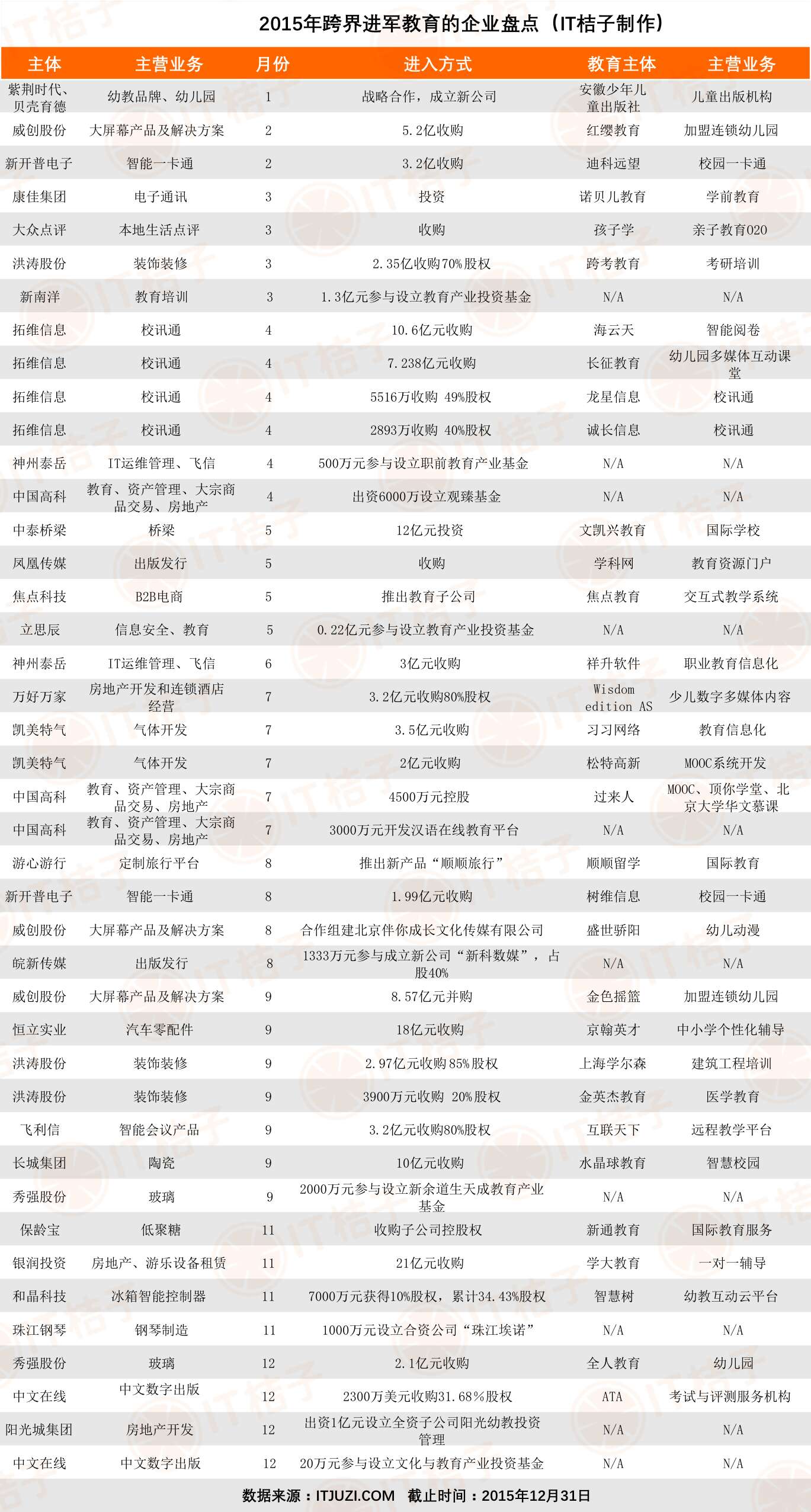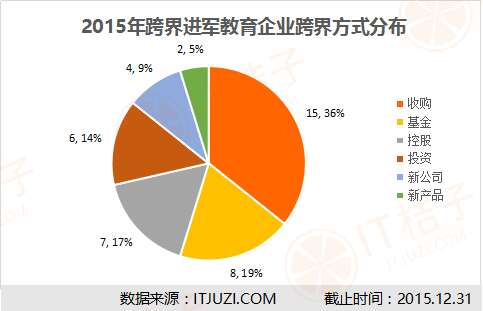 IT桔子通过公开信息汇总了2015年的跨界进军教育行业的案例,得出如下汇总表。
