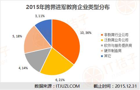 IT桔子将2015年42起跨界教育事件的28家跨界主体主营业务分类,可以分为硬件制造商,软件与服务提供商,泛教育业务公司,非教育行业公司和其它类型公司。所有公司中,A股上市公司占据了很大比例。