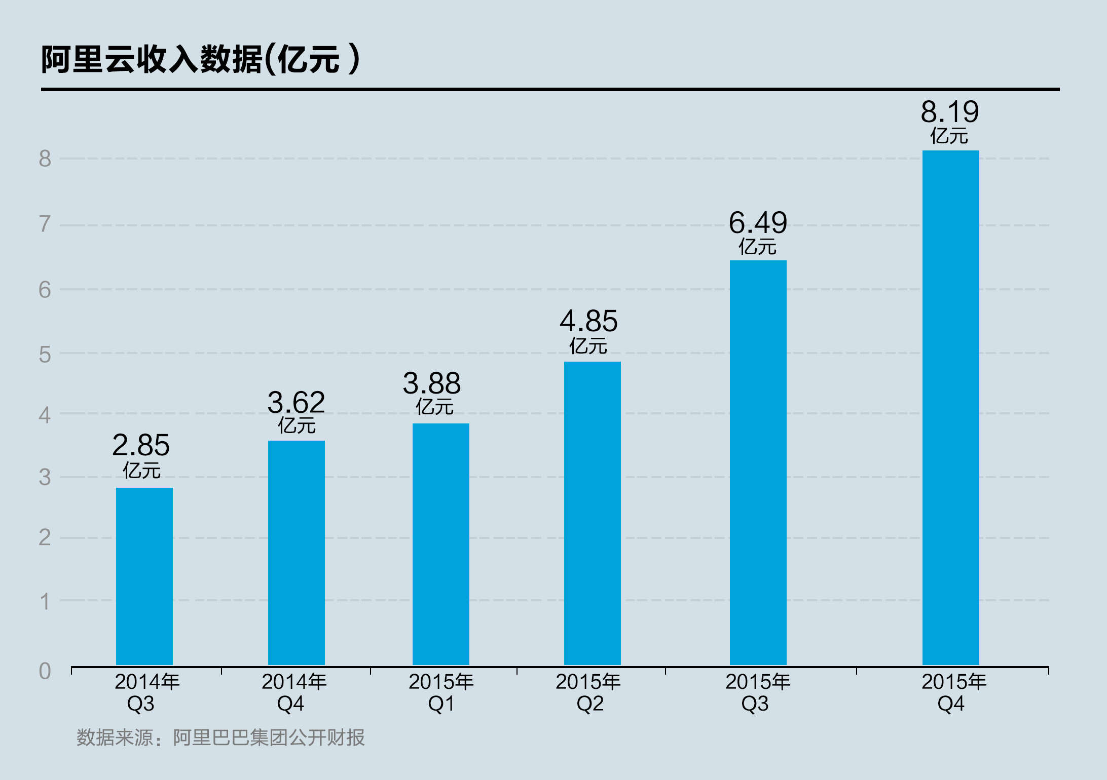 1月28日晚间,阿里巴巴集团(NYSE:BABA)发布2015年第四季度(2016财年第三季度)财报,旗下云计算业务阿里云保持强劲增长,营收增速亮眼。财报显示,阿里云第四季度营收8.19亿元,比去年同期增长126%,连续第三个季度保持三位数增长。综合2015全年数据,阿里云业务三连翻,阿里巴巴集团领跑技术竞争。