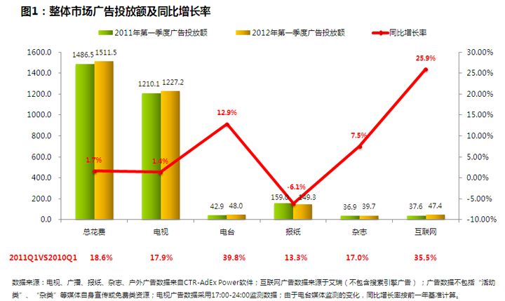 近日,中国领先的综合广告与媒体服务商昌荣传播(纳斯达克代码CHRM)对外公布了2012年第一季度中国广告市场研究报告。报告显示,2012年一季度,中国广告市场整体投放同比增幅仅1.7%,低于中国GDP8.1%的同比增长,为近年来最低增幅。五大媒体中,电视媒体继续占据着广告量的头把交椅,但增长速度呈现出放缓的趋势;电台继续维持着较高的增长,但增幅低于去年同期;报纸出现萎缩,同比下降6.1%;杂志同比增长7.5%;互联网高速增长的势头也明显减慢,中国广告市场进入慢车道发展(见图1)。